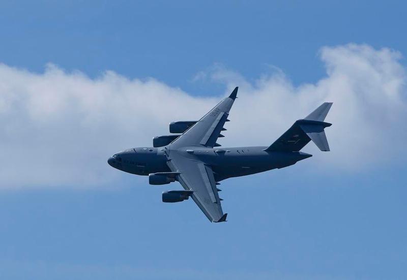 Sebuah pesawat C-17 Globemaster III milik Angkatan Udara Amerika Serikat melakukan demonstrasi udara dalam Abbotsford International Airshow 2023 di Abbotsford, British Columbia, Kanada, pada 12 Agustus 2023. (Xinhua/Liang Sen)