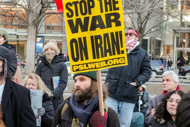 Warga berunjuk rasa menentang serangan militer Amerika Serikat (AS) terhadap Iran di New York, AS, pada 2 Maret 2026. (Xinhua/Zack Zhang)