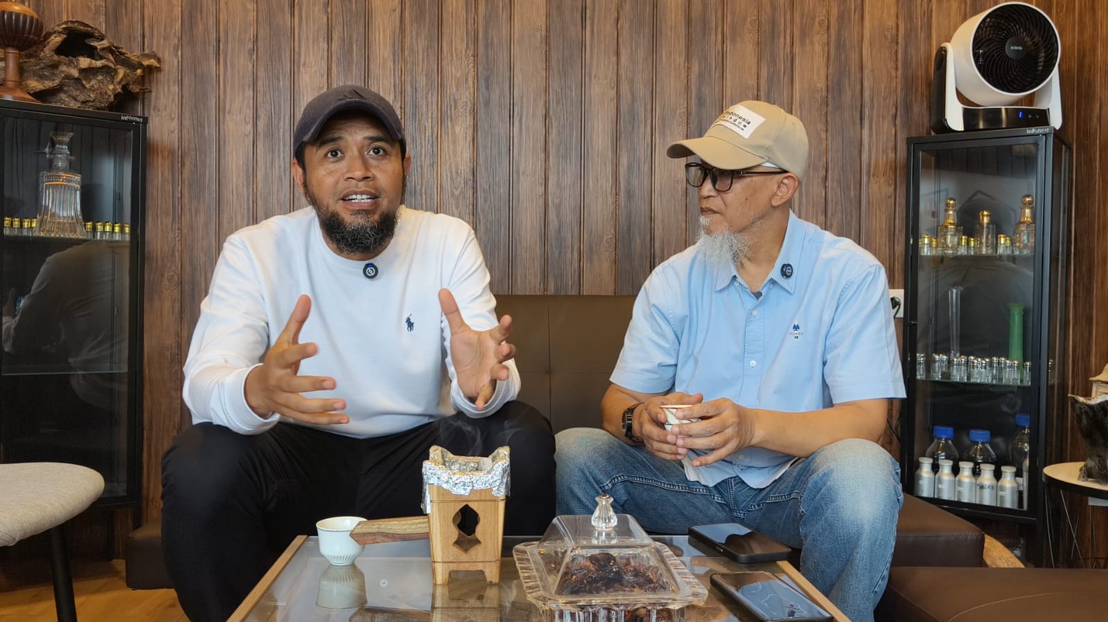 Zaky Al-Habsyi, an Indonesian gaharu businessperson (left), during a special interview with Indonesia Window, at his store, Al Amanah, in Bogor district, West Java province, on Thursday (April 23, 2026). (Indonesia Window/Ronald Rangkayo)