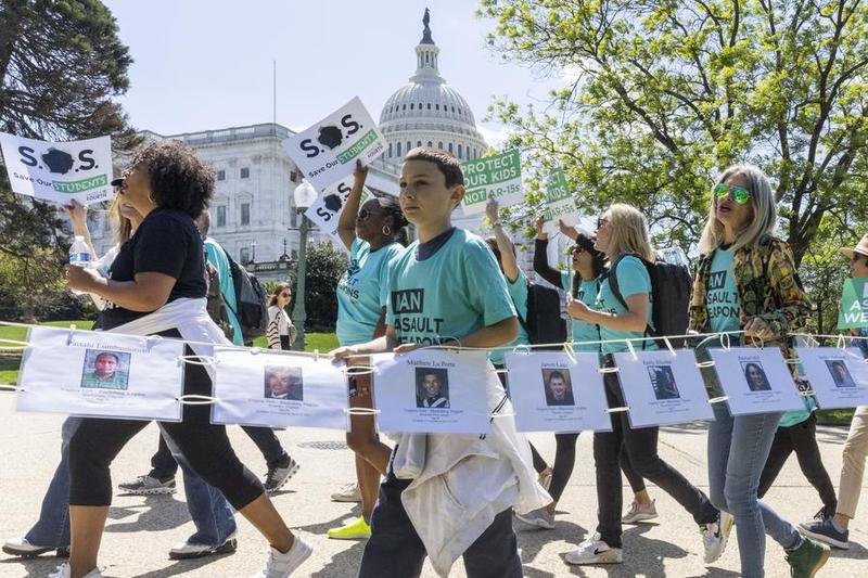 Orang-orang menunjukkan foto para korban kekerasan senjata api dalam sebuah aksi unjuk rasa menuju Capitol di Washington DC, Amerika Serikat, pada 17 April 2023, yang digelar untuk menyerukan larangan senjata serbu. (Xinhua/Aaron Schwartz)