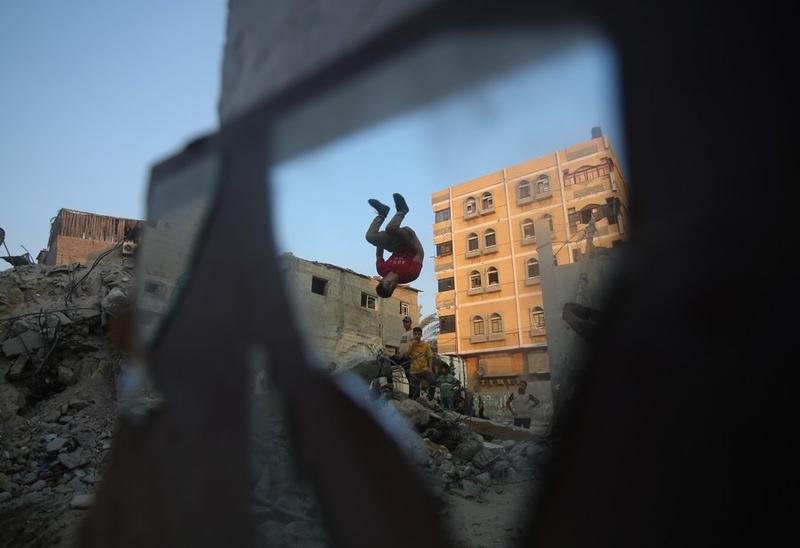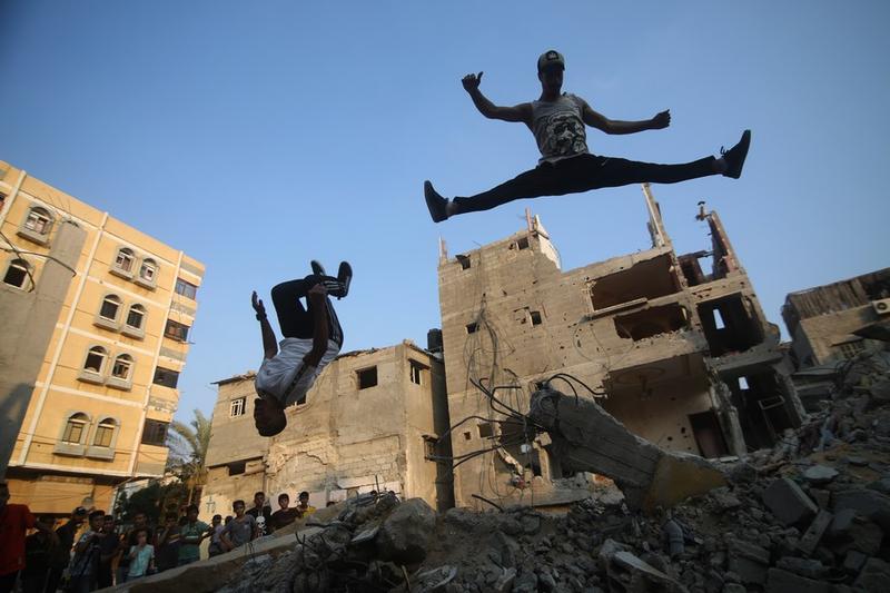 Dalam upaya untuk mengekspresikan kecintaan mereka terhadap kehidupan, lima pemuda Palestina berlatih parkur di atas puing-puing bangunan yang hancur di Kota Rafah, berayun di antara reruntuhan dengan aksi akrobatik yang impresif.