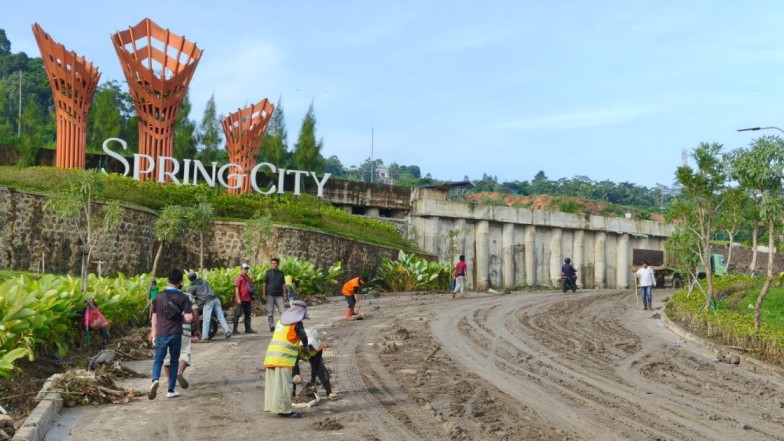 Para petugas membersihkan jalanan dari material lumpur dan bebatuan yang terbawa oleh banjir di kawasan perumahan, di kota mandiri Sentul City, Kecamatan Babakan Madang, Kabupaten Bogor, Jawa Barat, pada 12 Februari 2026. (Indonesia Window)