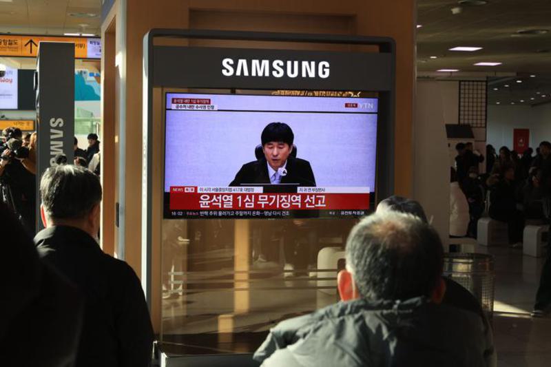 Orang-orang menonton siaran berita televisi tentang persidangan Yoon Suk-yeol di Stasiun Kereta Seoul di Seoul, Korea Selatan, pada 19 Februari 2026. (Xinhua/Park Jintaek)