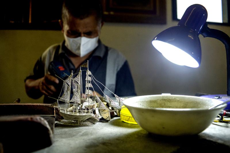 Foto yang diabadikan pada 25 April 2026 ini menunjukkan seorang perajin membuat kerajinan perak di sebuah pusat industri perak di Kotagede, Kota Yogyakarta, Daerah Istimewa Yogyakarta. (Xinhua/Agung Supriyanto)