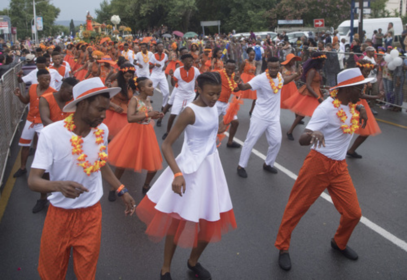Para penari tampil di sepanjang jalan dalam sebuah parade kendaraan hias bertema bunga di Provinsi Free State, Afrika Selatan, pada 8 Desember 2018. (Xinhua/Chen Cheng)