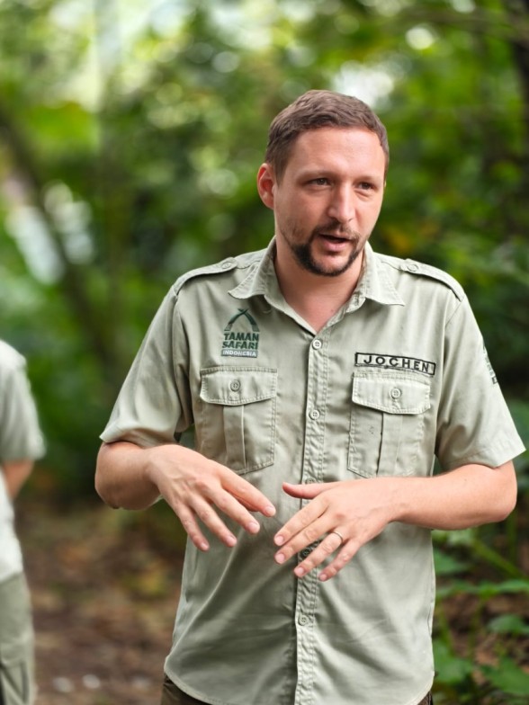 Jochen Menner, a curator at the Prigen Conservation Breeding Ark (PCBA), during a presentation at a media trip to the PCBA Prigen, Pasuruan district, East Java province, on Friday (December 19, 2025). (Indonesia Window)