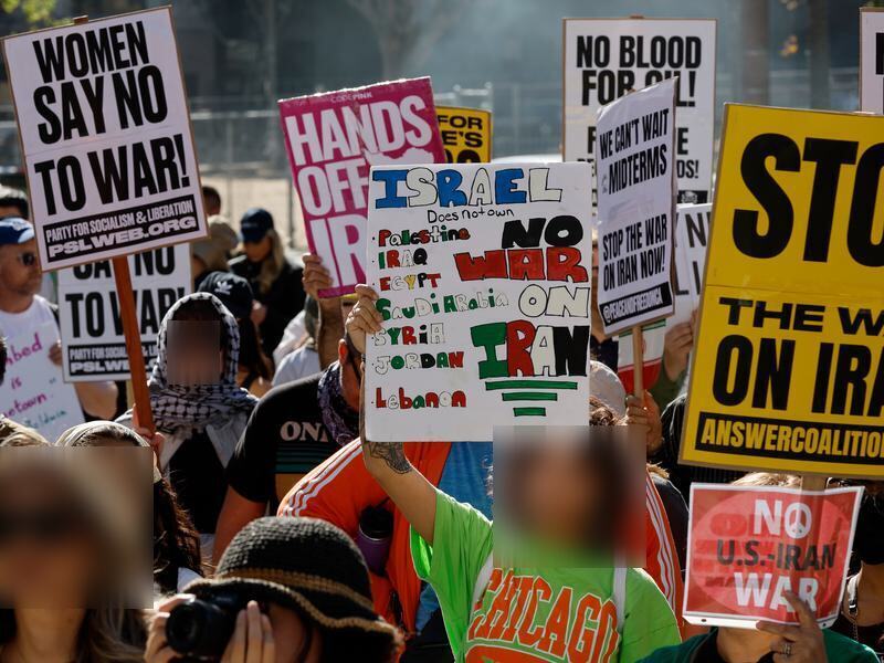 Orang-orang mengikuti aksi unjuk rasa di luar Balai Kota Los Angeles, California, Amerika Serikat (AS), pada 7 Maret 2026 untuk menentang serangan gabungan AS-Israel terhadap Iran. (Xinhua/Qiu Chen)