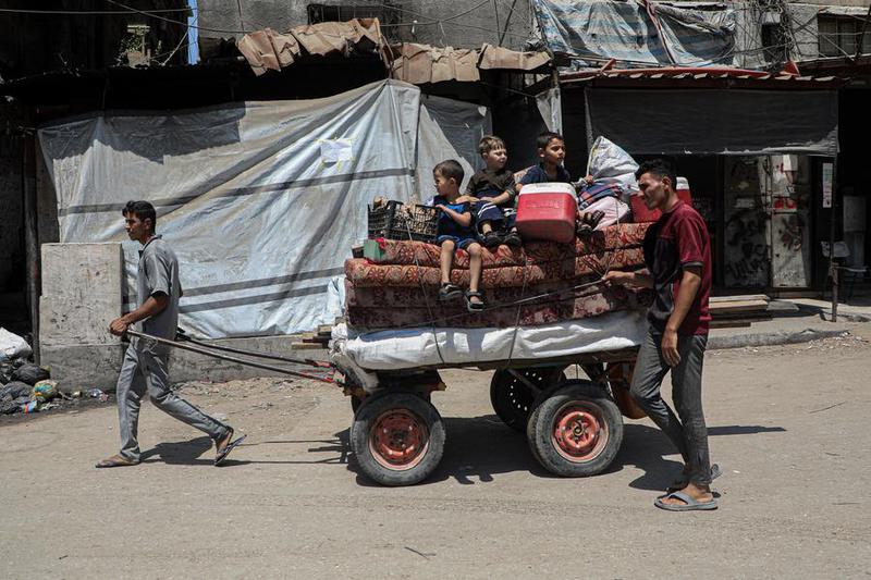 Warga Palestina membawa barang-barang mereka dan mengungsi dari area permukiman al-Tuffah di Gaza City timur pada 29 Juni 2025. (Xinhua/Rizek Abdeljawad)