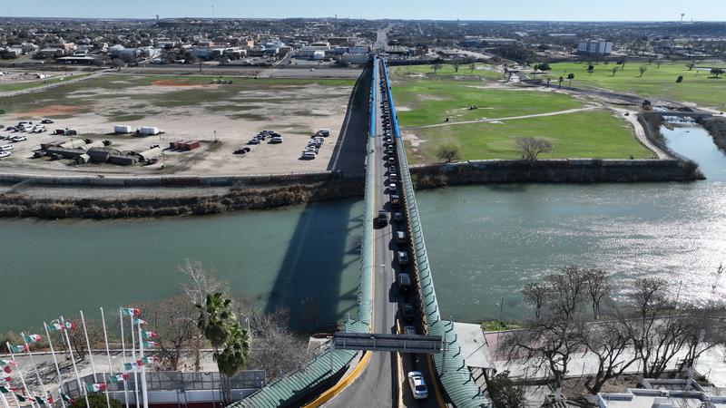 Foto dari udara yang diabadikan menggunakan drone pada 16 Februari 2025 di Piedras Negras, Coahuila, Meksiko, ini menunjukkan jembatan internasional antara Meksiko (depan) dan Amerika Serikat (AS). Meksiko dan AS dipisahkan oleh garis perbatasan sepanjang lebih dari 3.100 kilometer, dengan seksi timur sebagian besar dibatasi oleh Sungai Rio Grande. (Xinhua/Li Mengxin)